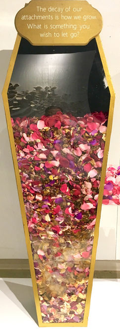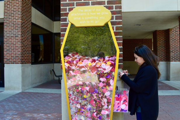 In my Sophomore year of college, I became intrigued with Fluxus art. I did not quite understand it, but I wanted it to be a part of my Sophomore Studio Project. Through my research on different interesting topics, I settled on pursuing the issue of attachment. I found many theories, rituals, and practices from different religions and cultures on how they detach themselves from life's earthly things and even themselves. As I researched, I never saw my answer to why we as humans sometimes have a hard time letting things go. I found that there are five degrees of attachment and its a long natural process, similar to grieving. The Art of Letting Go is an opportunity to participate in the natural process of letting go. Students at the University of Michigan were invited to write their attachments on fake flower petals and add them to a coffin filled with real flowers. The hope was that their attachments on the fake petals could die alongside the real flower's process of nature.
